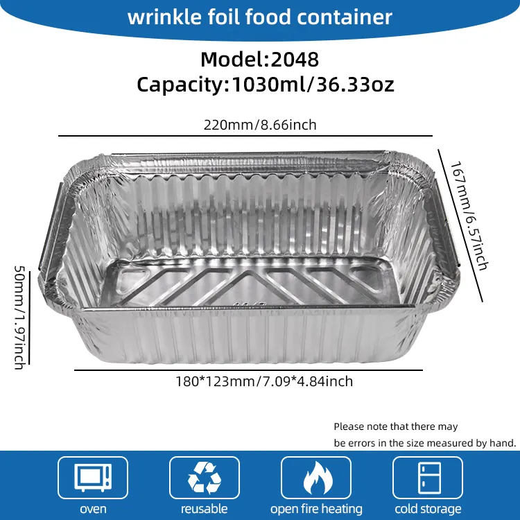 Kotak makan siang panggangan barbekyu sekali pakai dari Pabrik Aluminium Foil Yunchu, wadah aluminium foil perak terbuat dari aluminium foil food grade dengan kemurnian tinggi. Ini tidak beracun dan tidak berasa, tahan terhadap suhu tinggi dan suhu rendah. Titik lelehnya mencapai 250°C. Bisa kontak langsung dengan makanan. Itu tidak melepaskan zat berbahaya saat dipanaskan pada suhu tinggi. Ia juga dapat mempertahankan bentuk stabil saat didinginkan dan dibekukan. Ini adalah desain sekali pakai dan dapat dibuang setelah digunakan. Tidak perlu menghabiskan waktu membersihkan piring dan loyang, detoksifikasi sepenuhnya Ini memecahkan masalah pembersihan yang membosankan setelah makan, dan sangat cocok untuk adegan seperti berkumpul dengan banyak orang dan perjalanan di luar ruangan. Bahan aluminium foil tebal yang ditingkatkan memiliki tekstur padat dan daya dukung yang kuat. Tidak mudah bocor atau berubah bentuk saat memegang piring dengan sup atau bahan barbekyu yang berat. Tepinya halus dan bebas duri, sehingga lebih aman digunakan. Cocok juga untuk oven, penggorengan udara, pengukus, dan peralatan dapur lainnya. Memasak dan menyajikan dapat dilakukan dalam satu langkah.