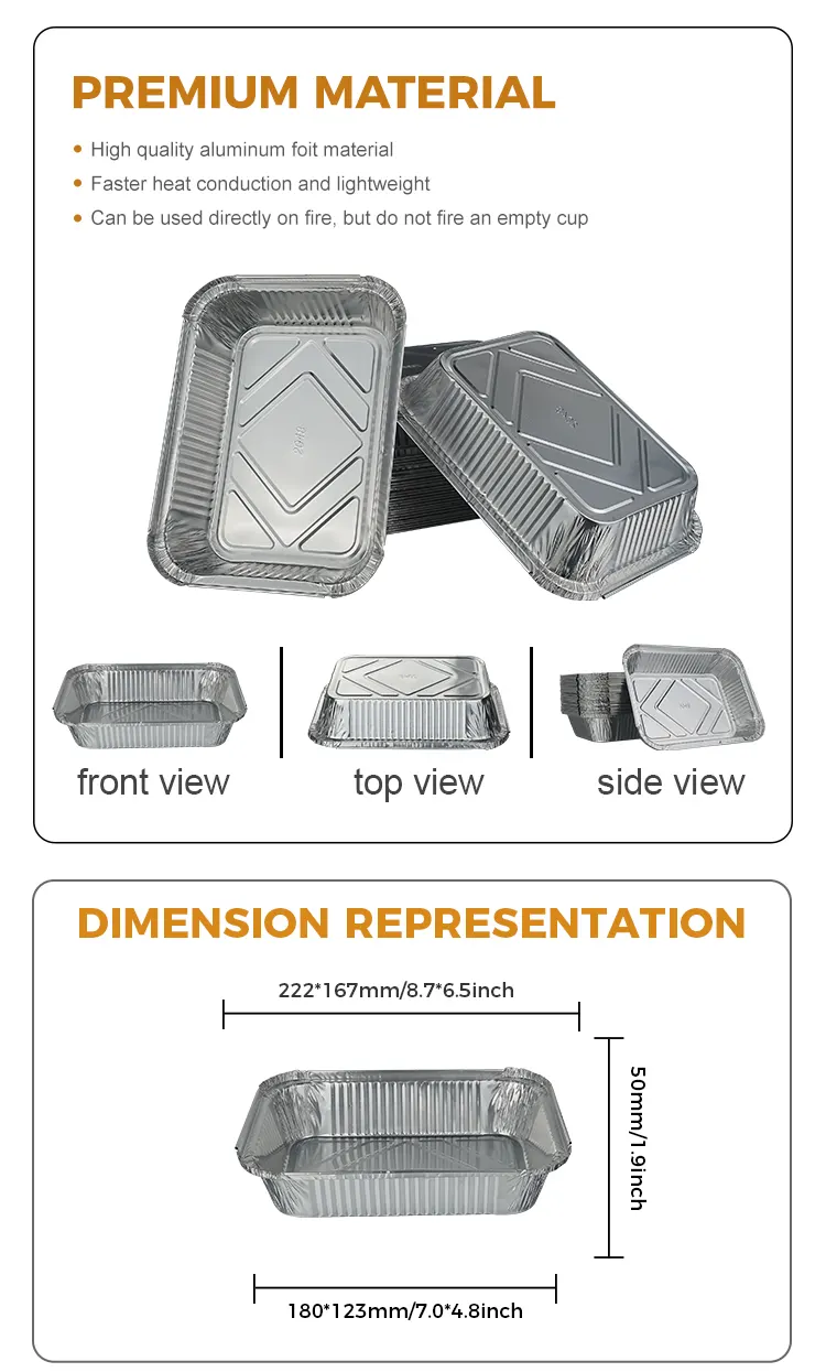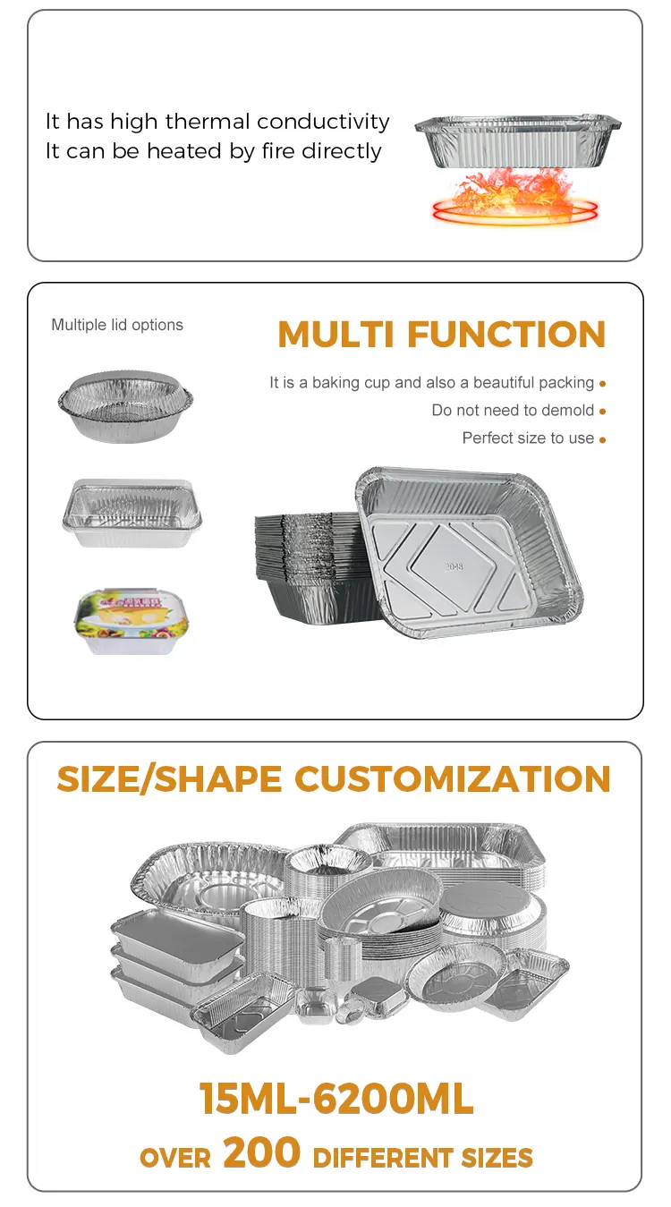 Kotak makan siang panggangan barbekyu sekali pakai dari Pabrik Aluminium Foil Yunchu wadah aluminium foil perak cocok untuk sebagian besar pemandangan, apakah itu restoran barbekyu, restoran Barat, restoran rumahan, atau toko roti, kotak makan siang aluminium foil perak ini dapat meningkatkan efisiensi. Restoran barbekyu bisa langsung menggunakannya untuk menyajikan tusuk sate panggang, sayuran panggang, dan makanan laut panggang. Tampilannya yang keperakan dipadukan dengan bahan-bahan yang harum. Ini memiliki dampak visual yang penuh dan menarik saat disajikan. Desain tanpa pembersihan mengurangi beban kerja pencuci piring di dapur dan menghemat biaya tenaga kerja. Ini sangat cocok untuk makan cepat selama jam makan puncak. Toko roti menggunakannya untuk menyajikan kue panggang, kue tar telur, dan biskuit. Bisa langsung dipanggang di oven dan tidak perlu dipanggang setelah dipanggang. Mengganti piring dan menempatkannya langsung untuk dijual adalah hal yang nyaman dengan tetap menjaga suhu dan bentuk makanan penutup; restoran rumahan dapat digunakan untuk dibawa pulang, dan desain anti bocor dapat secara efektif mencegah sup tumpah. Pelestarian panas aluminium foil dapat memperpanjang waktu suhu makanan yang konstan. Untuk berkemah, piknik, barbekyu di luar ruangan, dan kesulitan membawa peralatan makan besar serta membersihkan setelah makan, kotak makan siang aluminium foil sekali pakai ini dengan sempurna mengatasi masalah perjalanan luar ruangan. Bahannya tipis dan ringan, serta mudah disimpan. Dapat dilipat dan ditumpuk sesuka hati, tidak memakan ruang di ransel Anda dan tidak repot untuk dibawa.