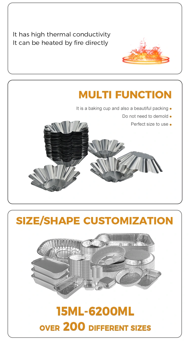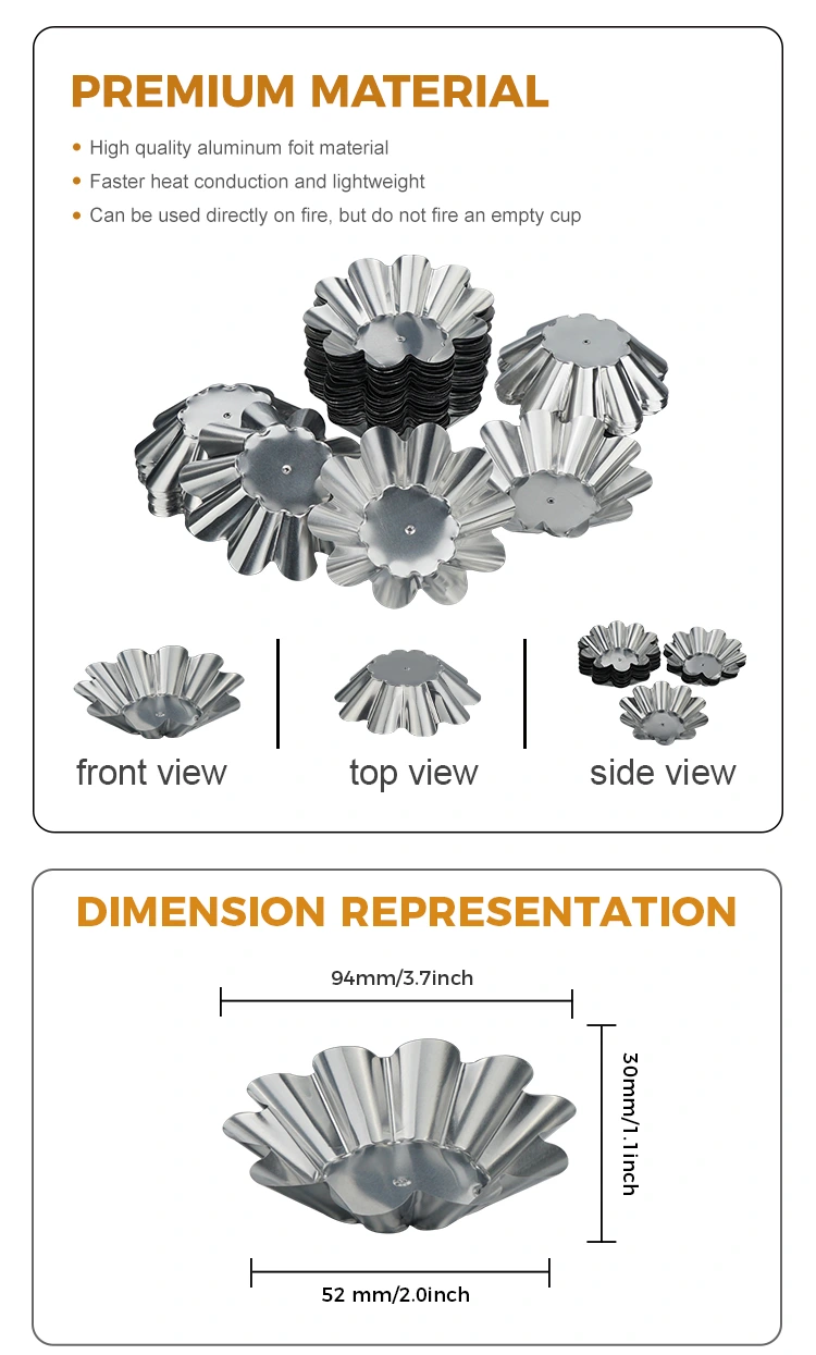 Adegan luar ruangan dan nyaman: Ringan dan portabel, cocok untuk berkemah di luar ruangan, piknik, pesta, dan pemandangan lainnya. Egg tart dan snack dapat disiapkan terlebih dahulu dan dimasukkan ke dalam wadah tanpa membawa loyang yang berat. Mereka bisa langsung dibuang setelah makan. Mudah dibersihkan dan tidak memakan tempat. Ini juga dapat digunakan untuk kemasan bawa pulang. Sifat penyegelan dan pelestarian panas dari bahan aluminium foil dapat secara efektif menjaga suhu dan rasa makanan penutup serta menghindari kebocoran dan deformasi selama pengangkutan.