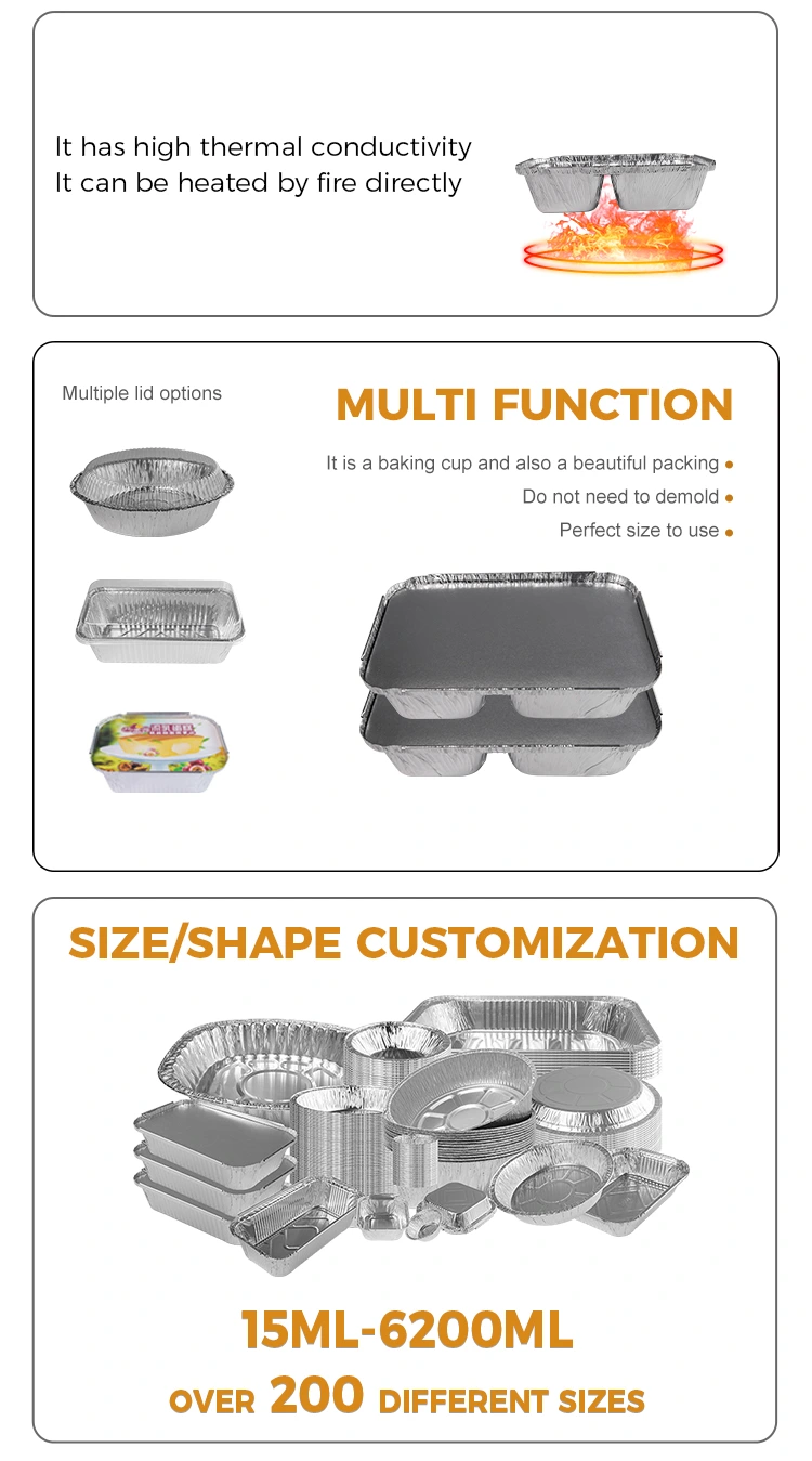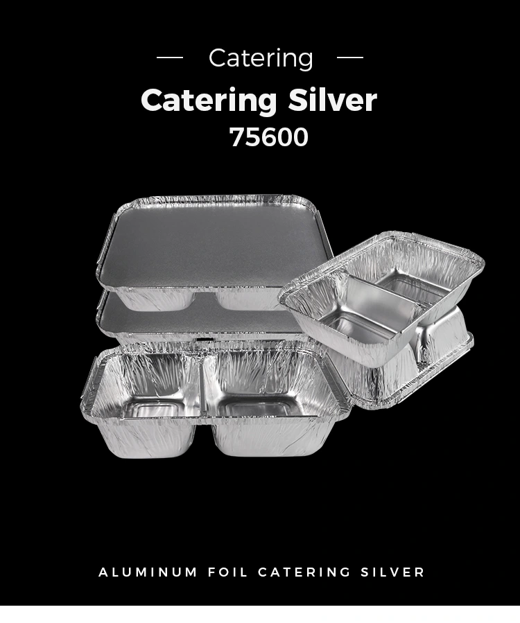 Permukaan kompartemen makanan cepat saji kompartemen aluminium perak wadah memiliki kilau tertentu, memberi orang pengalaman visual yang sederhana dan bersih. Pada saat yang sama, ia memiliki bentuk reguler dan dapat beradaptasi dengan berbagai persyaratan kemasan dan transportasi, seperti penumpukan dan penempatan.