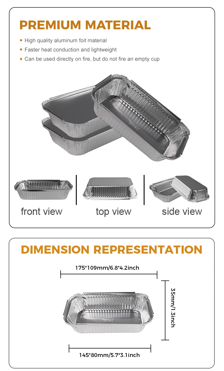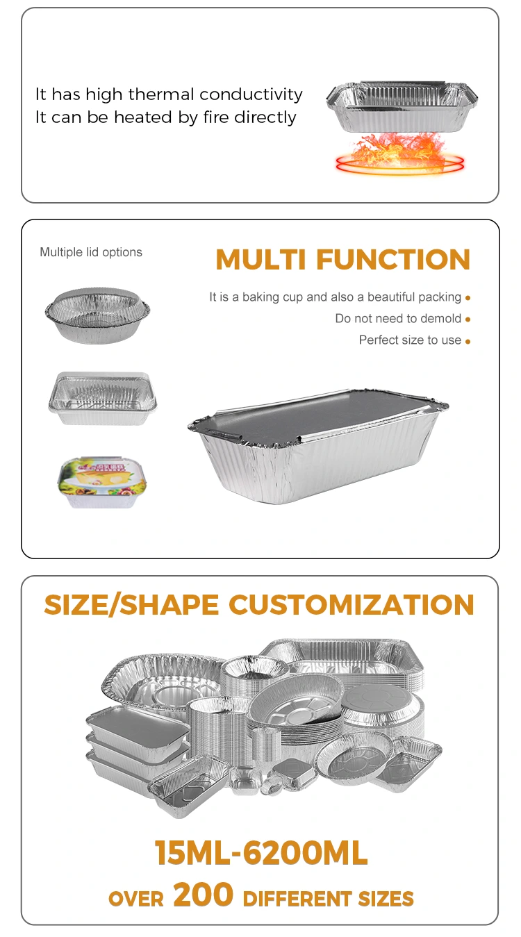 Kotak cepat makanan cepat saji ini, wadah foil aluminium perak perak terbuat dari bahan foil aluminium 8011 berkualitas tinggi, yang memiliki efek pelestarian panas yang baik dan dapat mempertahankan suhu makanan, membuat makanan lebih lezat dan lezat. Selain itu, wadah foil aluminium perak bbq persegi panjang kami juga dilengkapi dengan fungsi isolasi termal, yang dapat dipasangkan dengan tutup aluminium foil atau tutup plastik PET, yang nyaman untuk logo khusus dan selanjutnya meningkatkan citra merek.