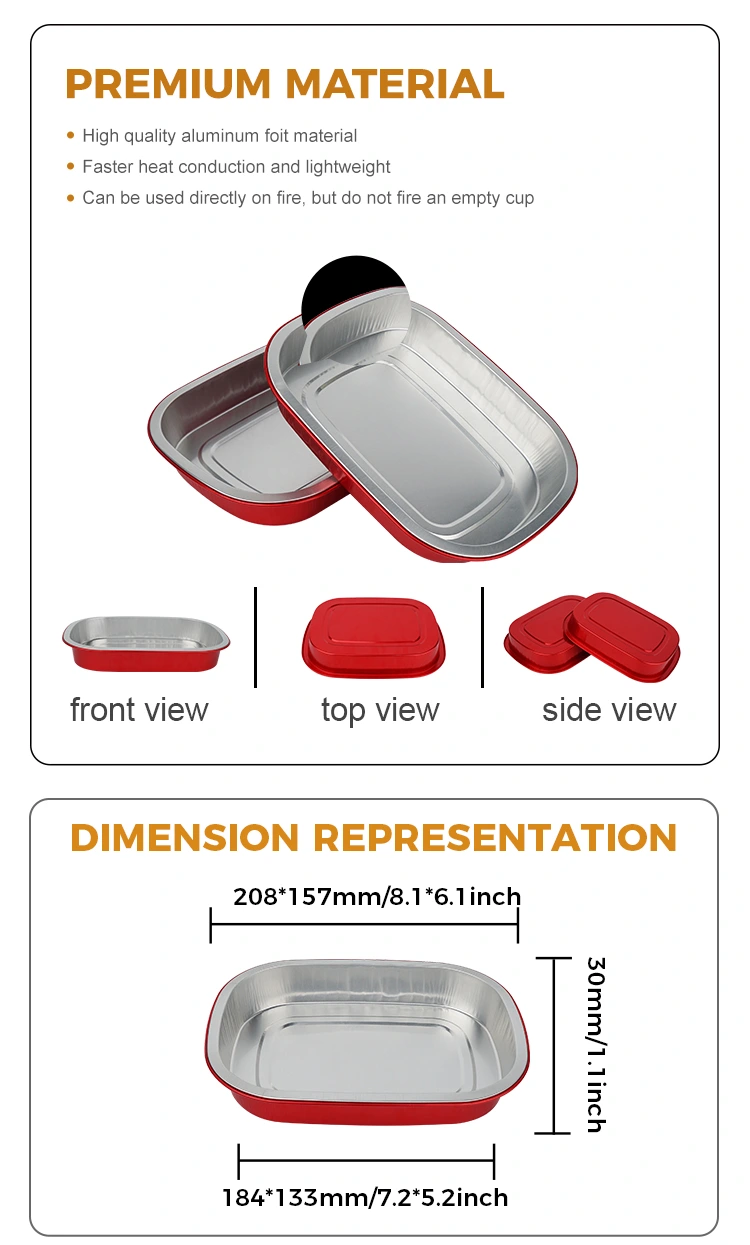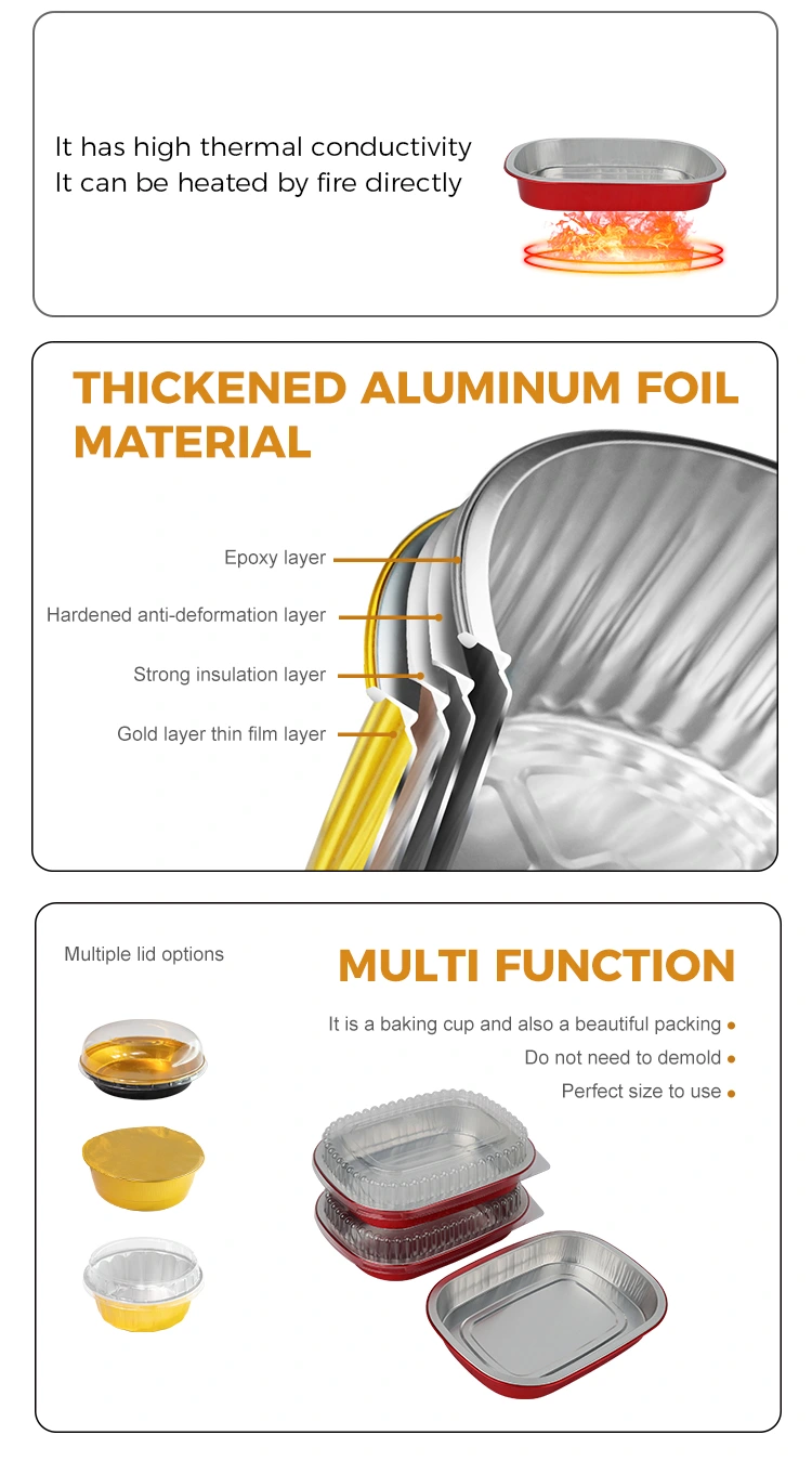 Apakah Anda seorang pembuat roti pemula yang membuat kue dan kue tar telur, atau pemain tingkat lanjut yang membuat pasta dan ikan utuh, Wadah Aluminium Foil persegi kotak makan siang merah sekali pakai dapat disesuaikan dengan sempurna. Tidak perlu menyikat minyak terlebih dahulu. Bahan-bahannya bisa langsung dimasukkan ke dalam kue. Setelah keluar dari oven, bisa langsung disajikan di piring, sehingga tidak perlu repot membongkar dan membersihkan loyang. Tampilannya yang keemasan membuat makanan yang dipanggang menjadi lebih istimewa. Memanggang loyang emas berisi kue cranberry dan ayam panggang selama festival langsung mengisi suasana reuni. Mengambil foto dan membagikannya di platform media sosial akan sangat menarik perhatian.