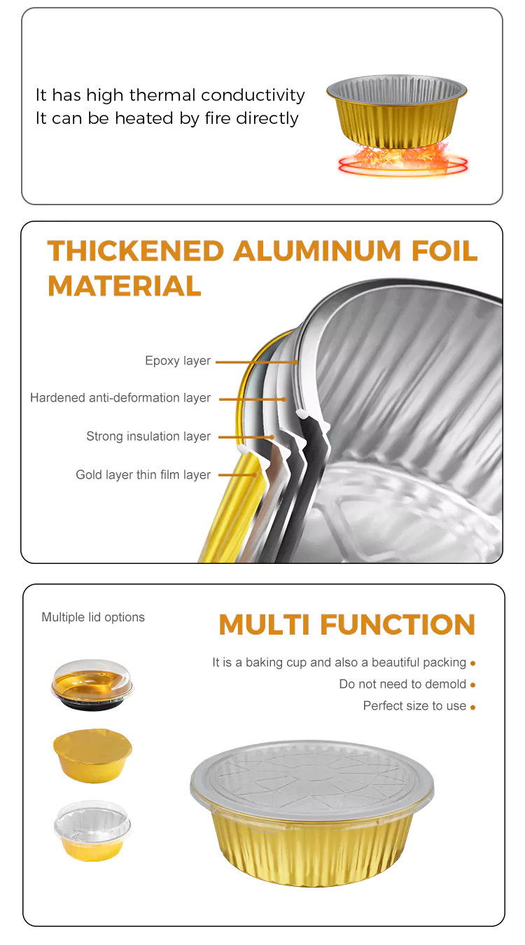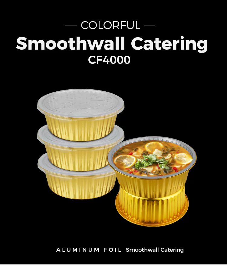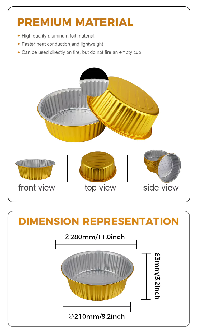 Wadah Aluminium Foil emas bulat berkapasitas besar sekali pakai dari Aluminium Foil Yunchu terbuat dari bahan dasar paduan aluminium 8011 food grade melalui proses penggulungan presisi dan pembentukan satu bagian. Dinding luar wadahnya halus dan dapat langsung bersentuhan dengan makanan dengan aman. Bahkan saat memegang makanan yang bersifat asam atau berminyak, dapat menjaga kestabilan bahan dan tidak meninggalkan sisa bau.