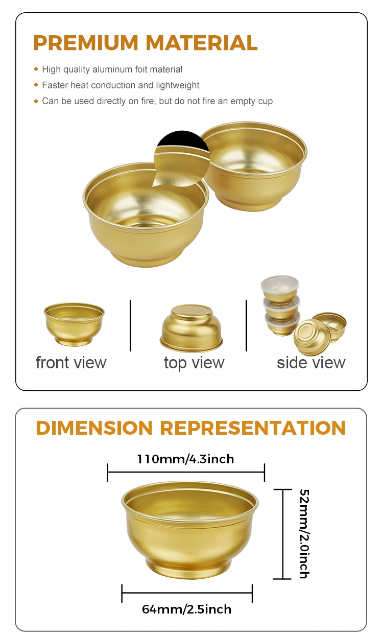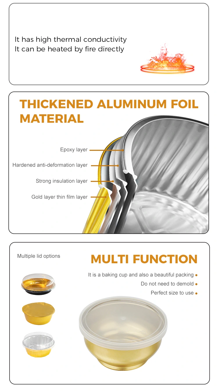 Pemasok aluminium foil Yunchu, Mangkuk emas kecil bulat sekali pakai Wadah Aluminium Foil, aluminium foil menebal, kekerasan tinggi, tidak mudah berubah bentuk, dapat disegel tanpa kebocoran, tahan panas yang kuat, dapat digunakan kembali, berfungsi sebagai cetakan dan kemasan, kemasan aluminium foil sterilisasi suhu tinggi aman, higienis, dan memiliki sifat insulasi termal yang baik - tahan panas yang kuat - dapat dikukus, didinginkan, dibekukan, dan dapat didaur ulang. Membran dalam PE food grade, bahan logam dipadukan dengan membran dalam PE food grade, badan toples tebal tidak berwarna dan tidak berbau membuat toples kecil tidak mudah berubah bentuk, memberikan perlindungan yang baik, keamanan dan keandalan penyegelan yang kuat, tutup botol menyatu erat dengan badan botol, penyegelan yang kuat menjaga kesegaran produk lebih lama, bahan benar-benar baru yang aman, ramah lingkungan, dan tidak berbau. Wadah Aluminium Foil mangkuk emas kecil bulat sekali pakai banyak digunakan di berbagai industri makanan seperti pabrik makanan, pabrik permen, pabrik buah kering, toko roti, toko makanan khusus, dan toko pemilahan buah kering, dll. Wadah ini digunakan untuk menampung makanan, permen, madu, plum kering, buah kering, kulit jeruk keprok tua, sari padat, cair, dan padat.