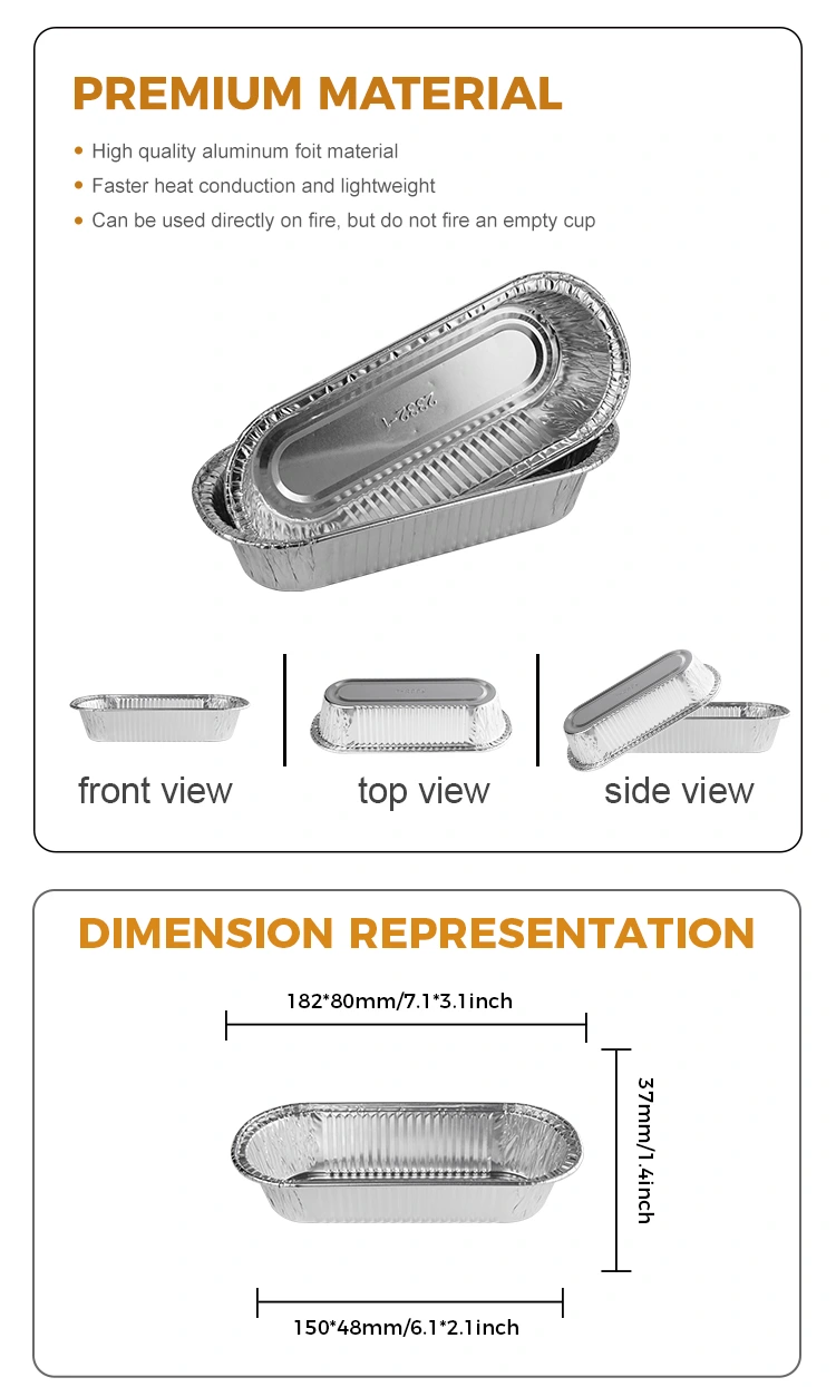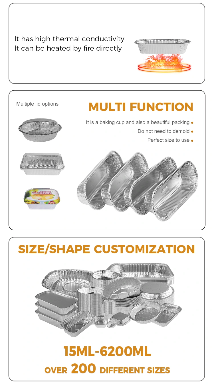 Yunchu aluminium foil pemasok oval air fryer memanggang wadah aluminium perak aluminium adalah jenis wadah yang dapat digunakan untuk mengukus, mendidih, memanggang, memanggang dan tujuan lainnya, dan dapat digunakan untuk saus, saus mencelupkan, bumbu kecil dan sampel sampel kue. Bahan foil aluminium tipe 8011-0, resistansi tarik dan resistensi korosi memiliki perpanjangan yang baik, bahan foil aluminium yang menebal, tahan lama dan tidak mudah dipecah, hemming, desain setengah lingkaran depan tidak ada salahnya, cetakan yang terintegrasi, permukaan dinding semulus cermin, ukuran yang kaya untuk digunakan dalam berbagai skenario.