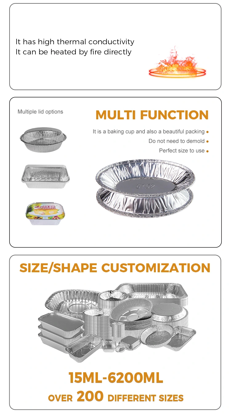 Fitur: Molding one-piece menebal dan tahan dipanggang, mengadopsi bahan foil aluminium kelas kontak, yakin akan kontak makanan, tidak mudah untuk cacat dan tidak bocor, ketebalan yang kuat, ketahanan korosi, ketahanan suhu tinggi.