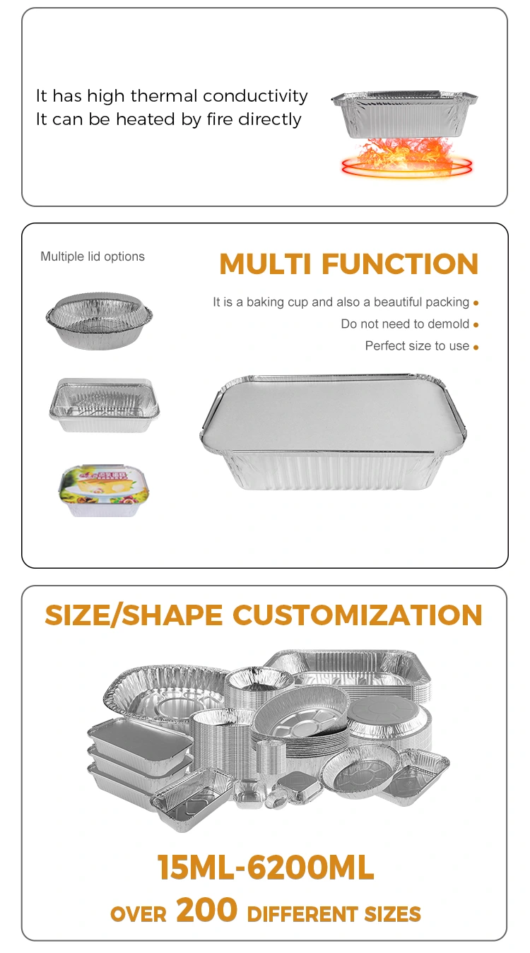 Yunchu Aluminium Foil Fryer Air Fryer Persekaronal ini mengepak wadah aluminium perak aluminium terbuat dari bahan foil aluminium 8011 berkualitas tinggi, yang memiliki kinerja isolasi panas yang sangat baik dan dapat secara efektif menjaga suhu makanan, membuat makanan lebih lezat dan lezat. Pada saat yang sama, wadah foil aluminium perak bbq persegi panjang kami juga dilengkapi dengan fungsi pelestarian panas, yang dapat dicapai dengan mencocokkannya dengan tutup aluminium foil atau tutup plastik PET, yang nyaman untuk logo yang disesuaikan dan dengan demikian meningkatkan citra merek.