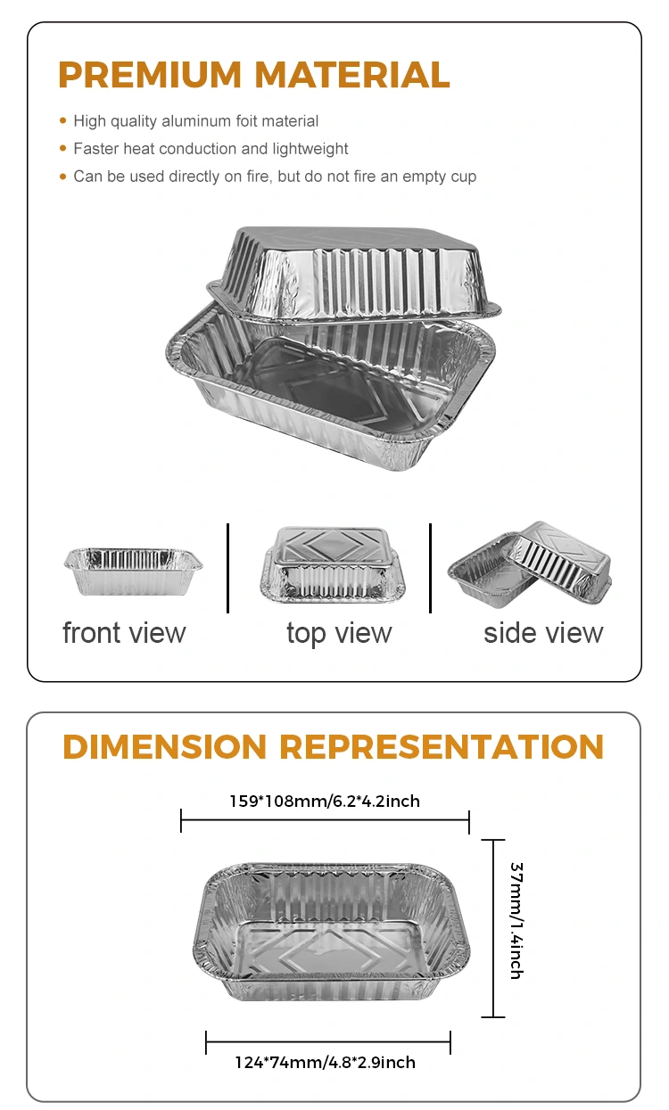 2322 Baking Panci Persegi Panci Perak Foil Container dari Yunchu Aluminium Foil Supplier diproduksi dengan bahan aluminium foil grade makanan, memastikan keamanan dan sifat makanan bebas bau. Produk ini bebas bersih dan dapat didaur ulang, memberi Anda lebih banyak ketenangan pikiran saat menggunakannya. Ini memiliki dimensi 159 mm (6,2 in) dan 108 mm (4,2 in) diameter atas, 124 mm (4,8 in) dan 74 mm (2,9 in) diameter lebih rendah, tinggi 37 mm (1,4 in), dan kapasitas sekitar 400 mL (14,1 oz). Kotak foil aluminium memiliki fungsi pelestarian panas yang sangat baik, terutama cocok untuk kontrol suhu dalam makanan yang dibawa dan berbelanja, apakah itu kue kecil atau bahan buah.
