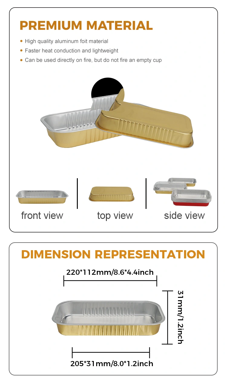 Aluminium foil Yunchu menyediakan Wadah Aluminium Foil Smoothwall Panggang Emas Persegi Panjang, yang tidak hanya cocok untuk skenario memanggang tetapi juga untuk dibawa pulang, dan juga dapat membantu Anda dalam penyimpanan sehari-hari: