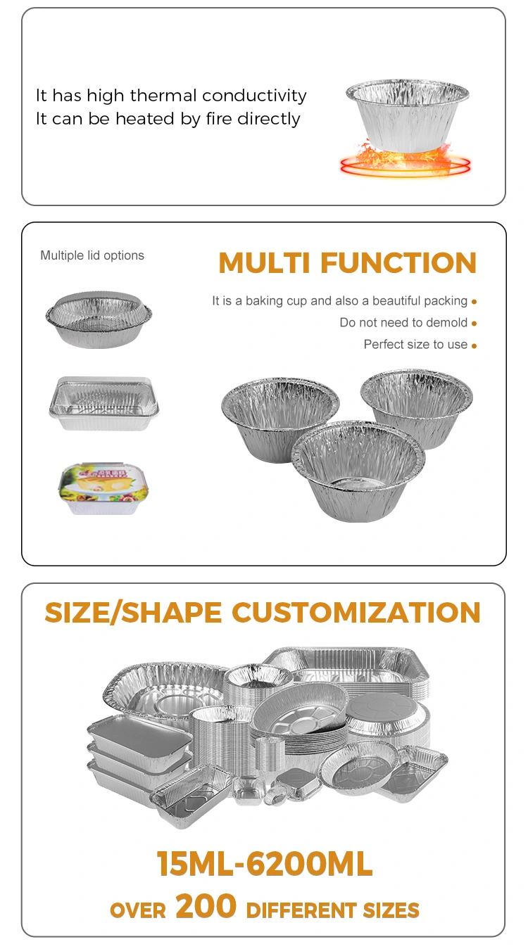 Kedua, selama kue, kue bundar kue aluminium aluminium wadah wadah wadah unggul. Ini memiliki konduktivitas termal yang baik dan dapat secara merata mendistribusikan panas selama memanggang, menghindari overheating atau dasar panas. Pada saat yang sama, stabilitasnya juga sangat baik, menjaga stabilitas struktural bahkan di lingkungan suhu tinggi dan tidak mudah berubah bentuk.