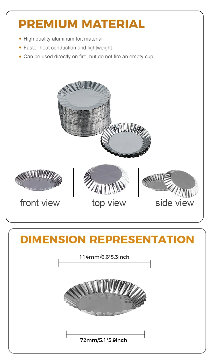 Bahan wadah aluminium foil liner kue kue bundar terbuat dari aluminium foil berkualitas tinggi, yang memiliki ketahanan suhu tinggi yang baik dan secara efektif dapat mencegah minyak dari makanan menembus ke dalam foil, sehingga menjaga kesegaran dan rasa makanan. Permukaannya halus dan halus sehingga memudahkan memasukkan makanan ke dalamnya tanpa meninggalkan residu.