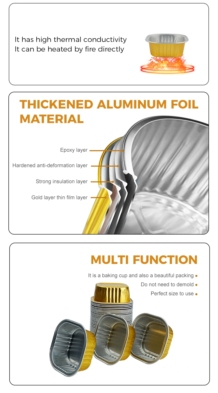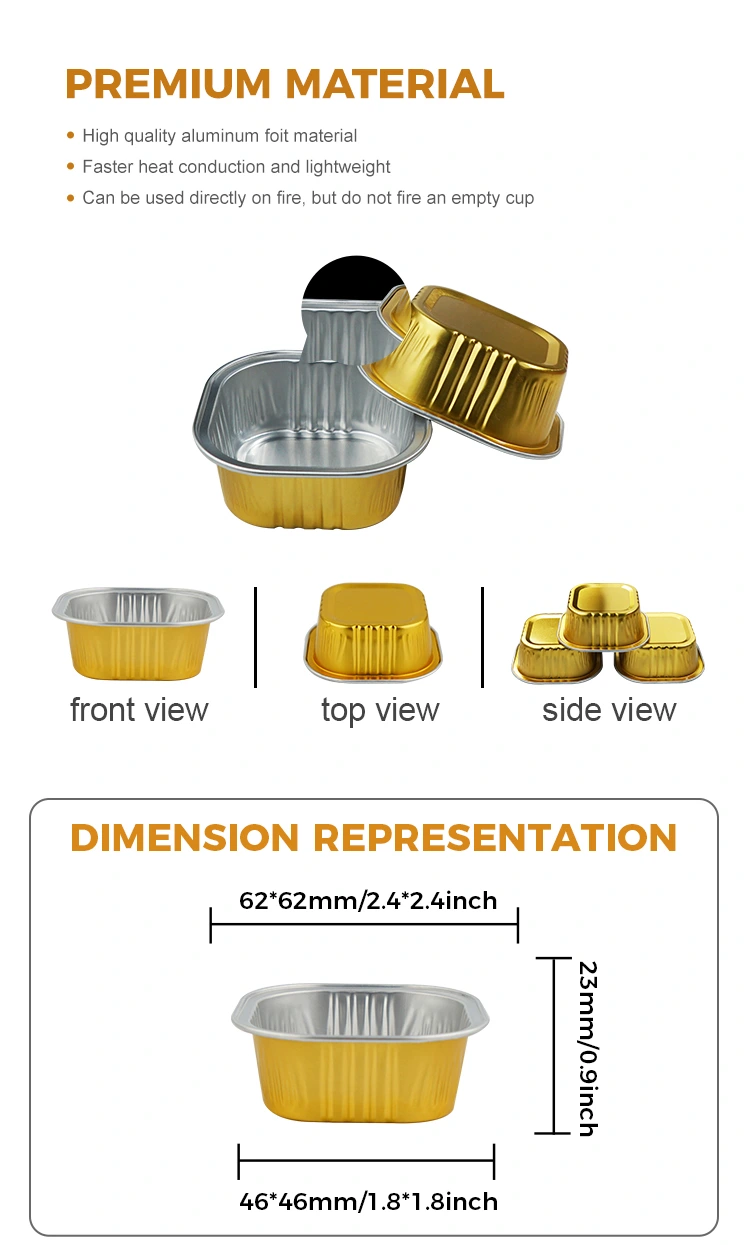 Perlindungan panci yang kuat, Cangkir kue pencuci mulut persegi Wadah Aluminium Foil Smoothwall sangat nyaman untuk dibuang begitu saja jika kotor, pelat aluminium foil, panci akan bersih setelah digunakan, kertas gulung, pinggirannya tidak mudah bocor minyak, makanan tidak mudah lengket, sehingga lebih mudah untuk diambil.