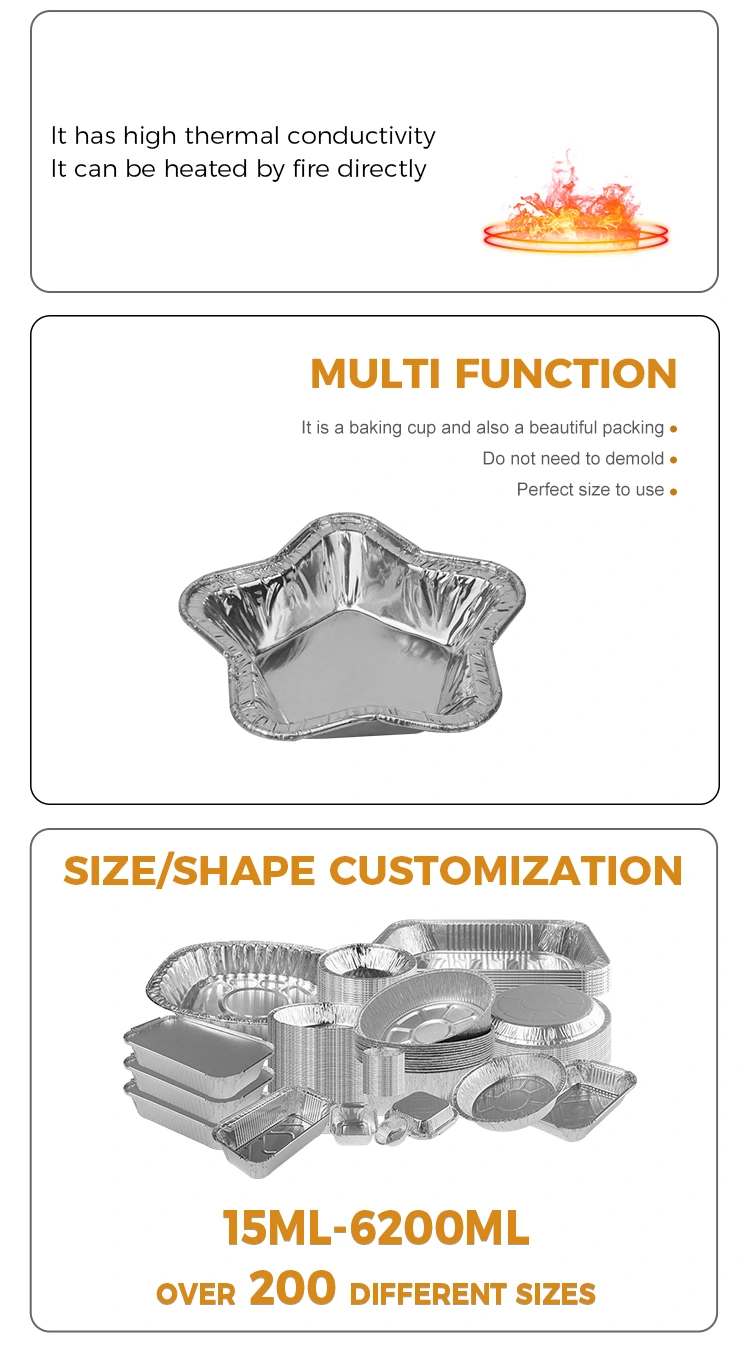 Pemasok aluminium foil Yunchu Cangkir tart aluminium foil berbentuk bintang untuk memanggang Wadah Makanan Aluminium Foil, cetakan kue tart aluminium foil tebal dengan bentuk stabil, terbuat dari bahan aluminium foil food grade, memudahkan pembongkaran setelah dipanggang. Cangkir tart aluminium foil berbentuk bintang untuk memanggang Wadah Makanan Aluminium Foil ini tahan suhu tinggi, tidak mudah terbakar atau lengket, dengan bagian bawah dan tepi yang dirancang dan diproses untuk konduksi panas yang merata, cetakan terintegrasi yang menebal dan diperkuat, biasa digunakan untuk menggoreng udara, mengukus, memanggang, dll.